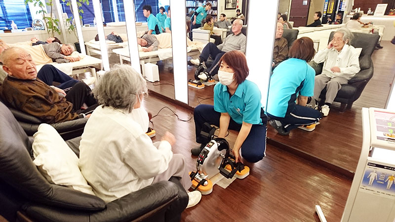 近代モダンな空間で優しい香りに包まれ、開放感溢れる 癒しの空間をお楽しみいただけます。 足浴は13~15名がゆっくり入れるスペースで、心身ともに リラックスできます。 フロア内もゆとりがあり歩行訓練も十分に行えます。